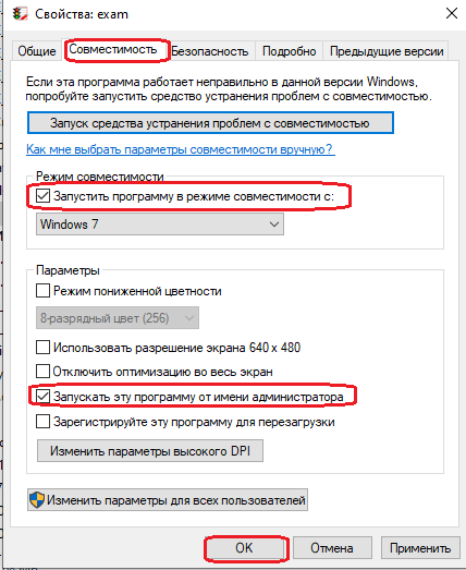 Необходимо настроить параметры совместимости исполнемого файла exam.exe